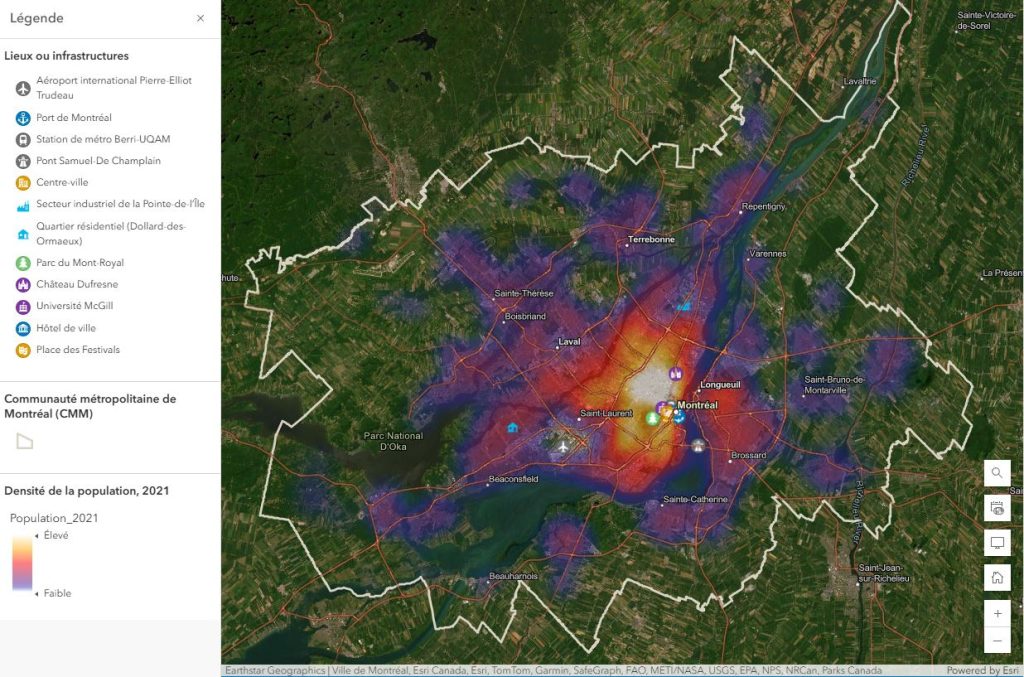 Sous le thème des métropoles, les élèves ont été invités à localiser des infrastructures ou des sites dans la communauté métropolitaine de Montréal. Chaque pictogramme de lieu possède une fenêtre contextuelle contenant une photo de l’endroit.